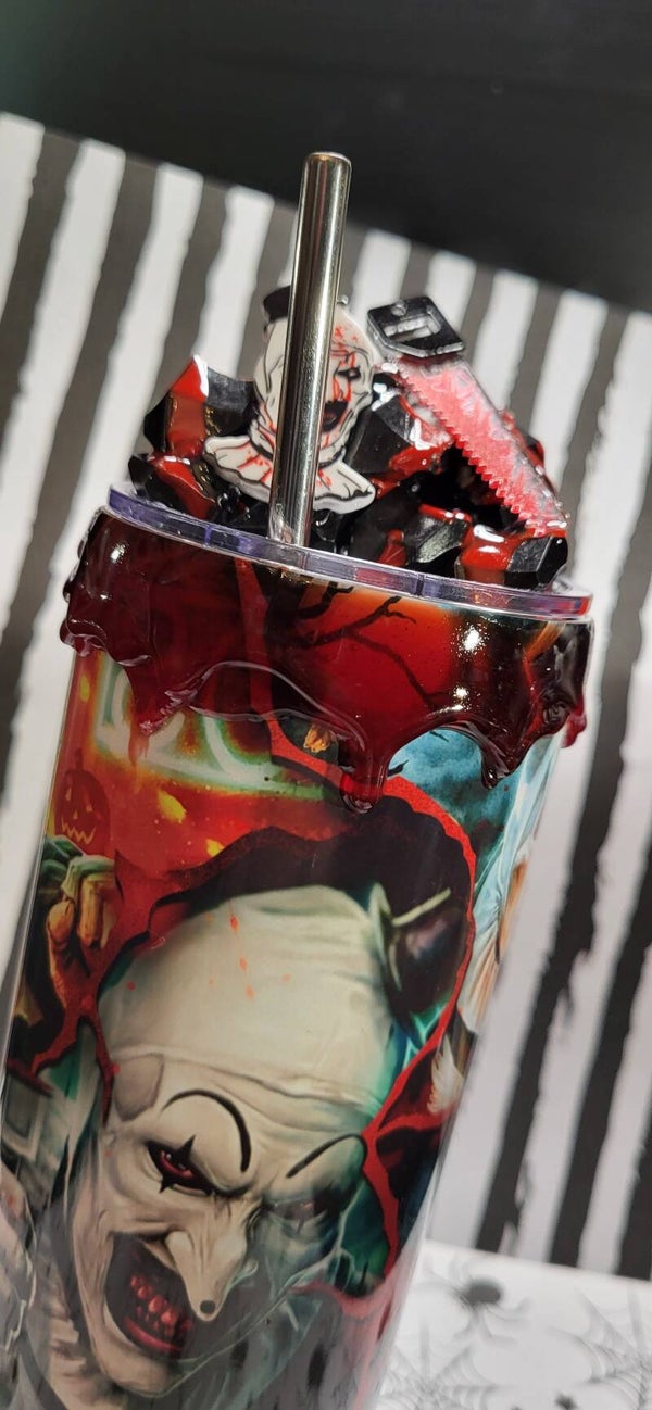 Blutige Details, ein diabolischer Clown und ein gefährlich aussehendes Messer machen diesen 20oz Tumbler zum ultimativen Schocker für echte Horror-Fans!