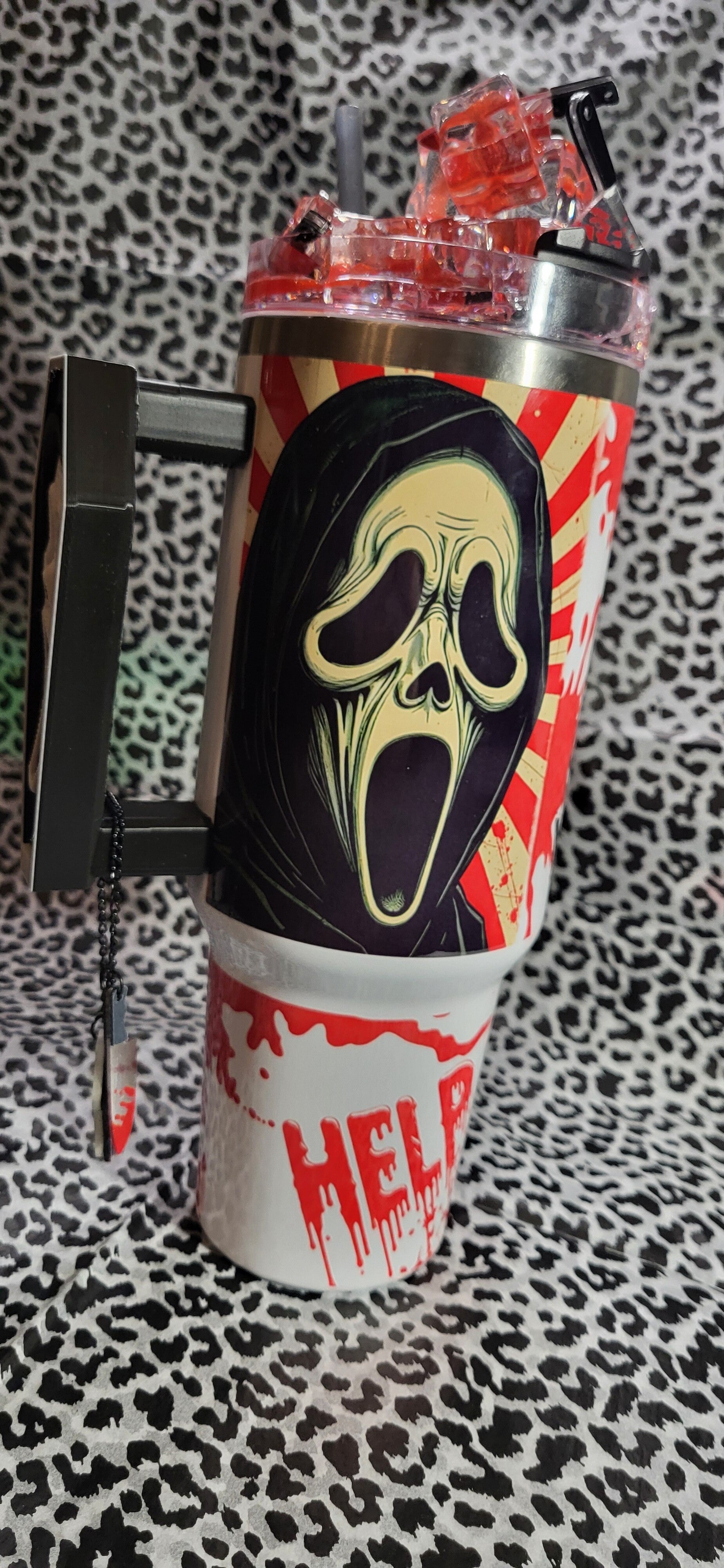 Blutiges Motiv: Der untere Teil des Tumblers ist mit Blutspritzern gestaltet – ein echter Hingucker!