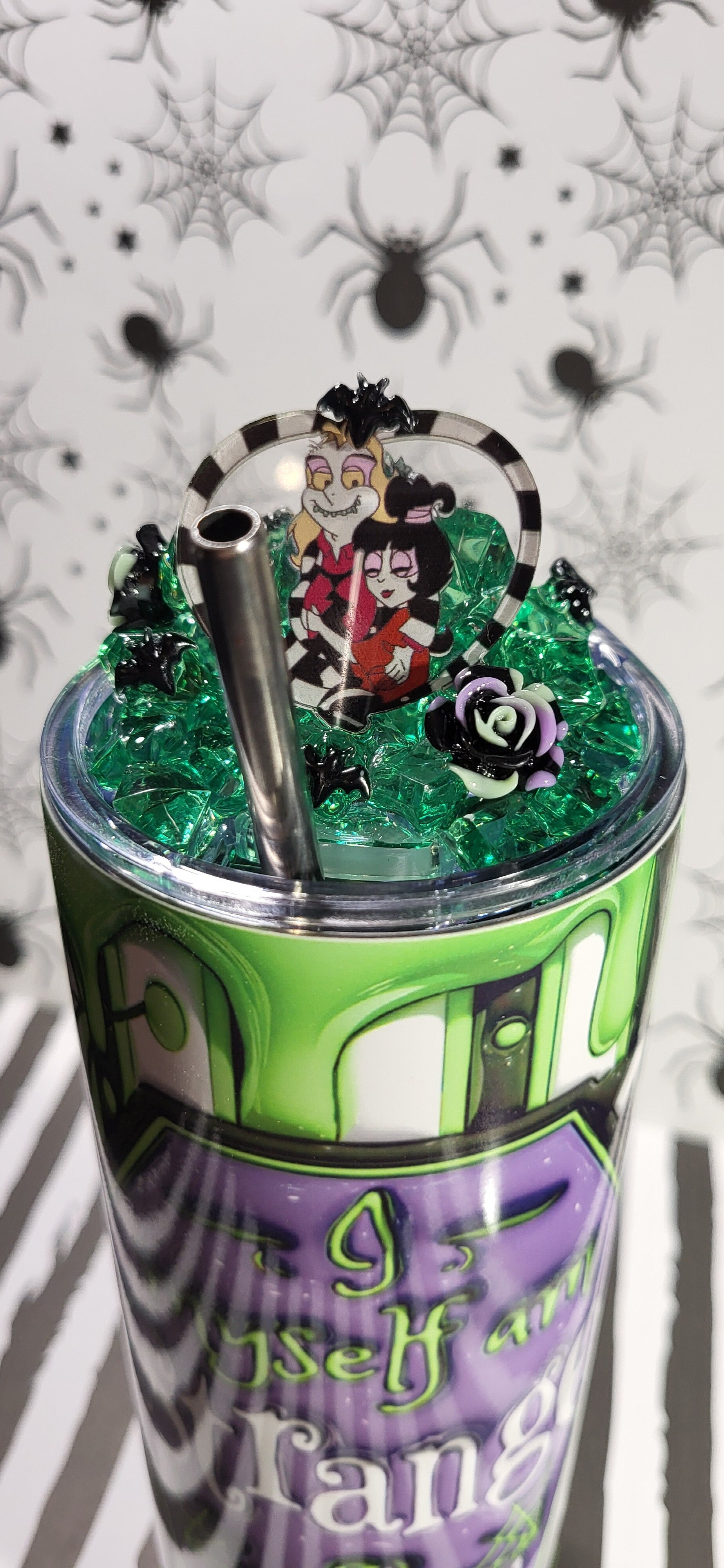 Der Deckel ist verziert mit grünen Eiskristallen, süßen kleinen Fledermäusen, einer schwarz-lila Rose und einem verspielten Cartoon-Pärchen, das Beetlejuice und Lydia darstellt – ein unvergessliches Duo der etwas anderen Art.