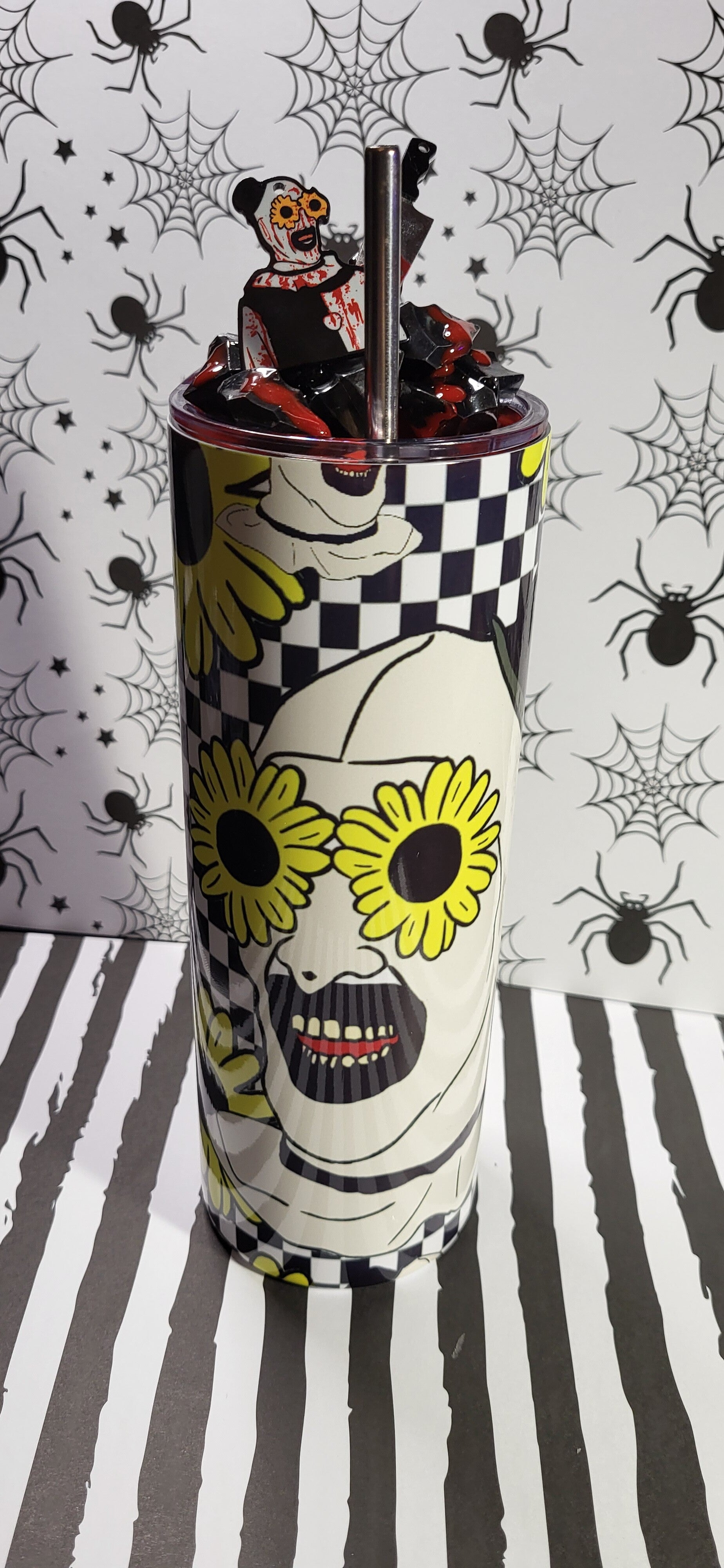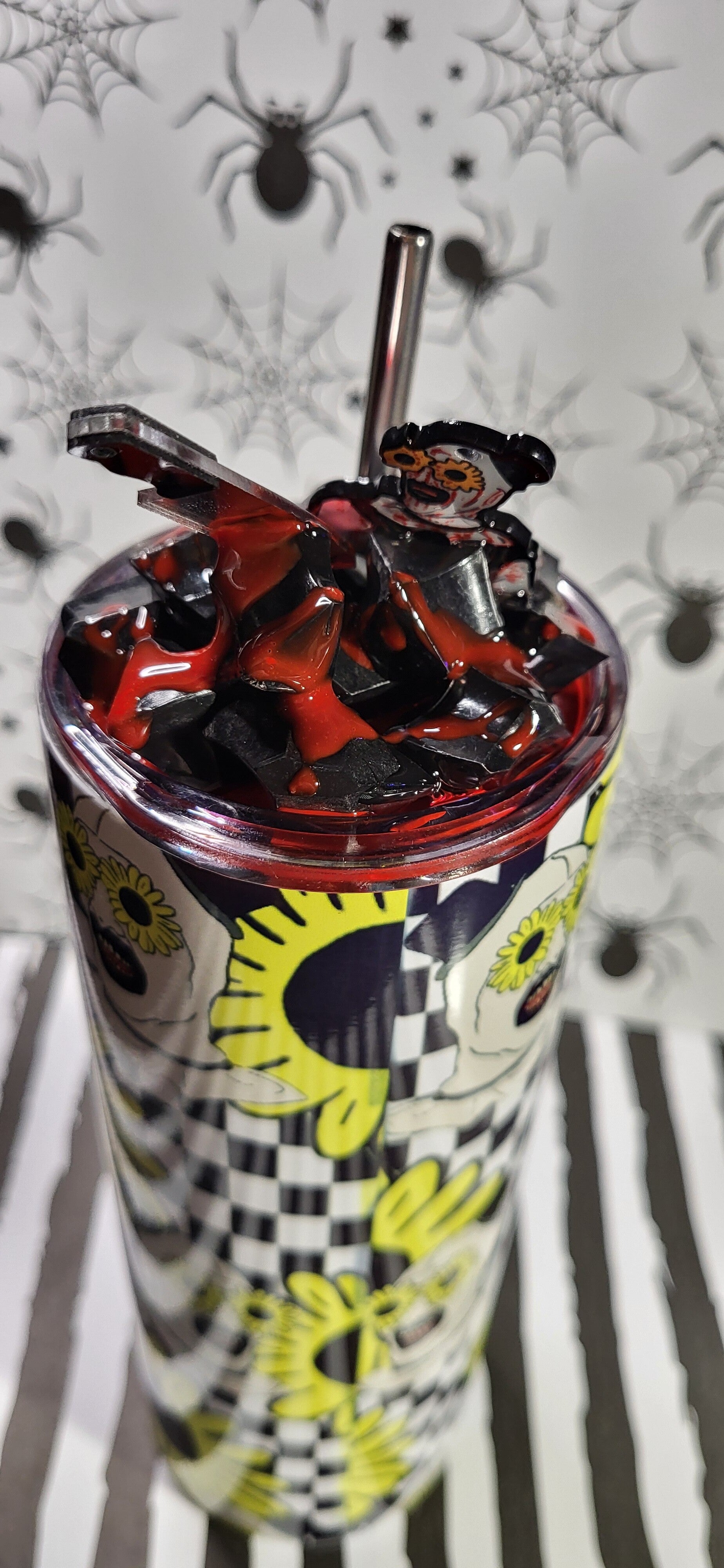 Wenn du auf schräge Killerclown-Vibes mit einem Schuss Wahnsinn stehst, ist dieser Tumbler wie für dich gemacht! Mit einem knalligen Mix aus Sonnenblumen, Checkerboard-Muster und dem wahnsinnig charmanten Clown-Motiv zieht er alle Blicke auf sich. Doch das wahre Highlight ist der Deckel: Mit blutrotem Kunstharz, schwarzem „Eis“ und einem kleinen Clown samt Hackebeil wird dieser Becher zum perfekten Horror-Statement.