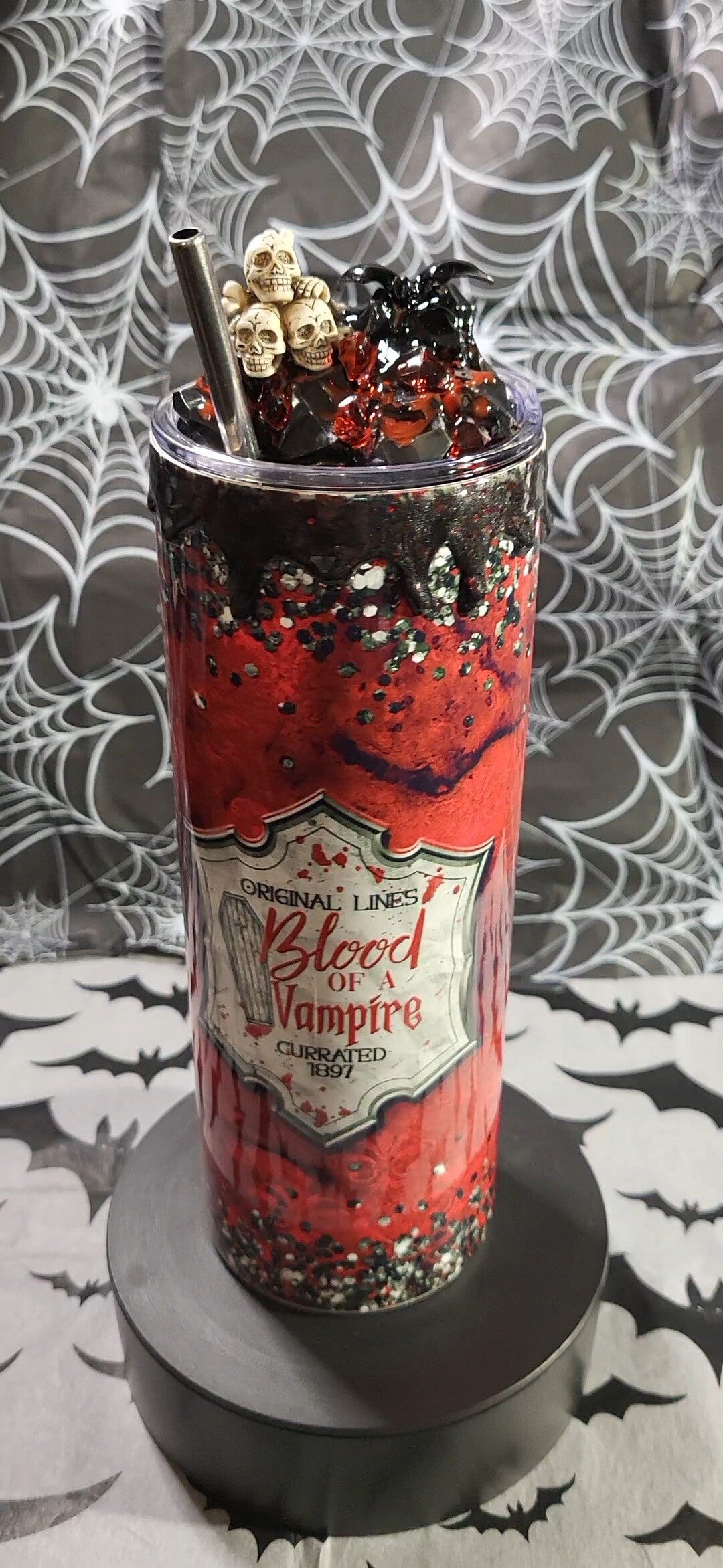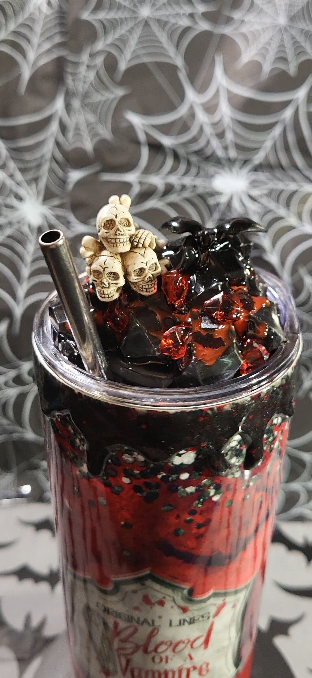 Dieser 20oz Tumbler sieht aus, als käme er direkt aus Draculas Privatbar! Glänzendes Blutrot trifft auf schwarze Glitzer-Drips, funkelnde Kunst-Eiswürfel und eine Deckel-Deko, die selbst Blutsauger nervös macht: kleine Totenschädel, schwarze Flügel und ein silberner Strohhalm, der aussieht wie eine Waffe aus einem Gothic-Fiebertraum.