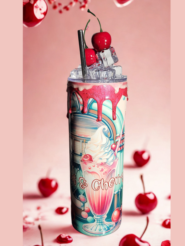 Let’s twist again – aber diesmal mit Stil! Der „Shout & Cherry“-Tumbler bringt den knalligen Retro-Vibe der 50s direkt in deine Hände. Mit cooler Jukebox-Optik, leckeren Milkshake-Illustrationen und knallroten Kirschen als Topping ist dieser Becher ein echter Blickfang für alle Vintage-Queens und Rock’n’Roll-Herzen.