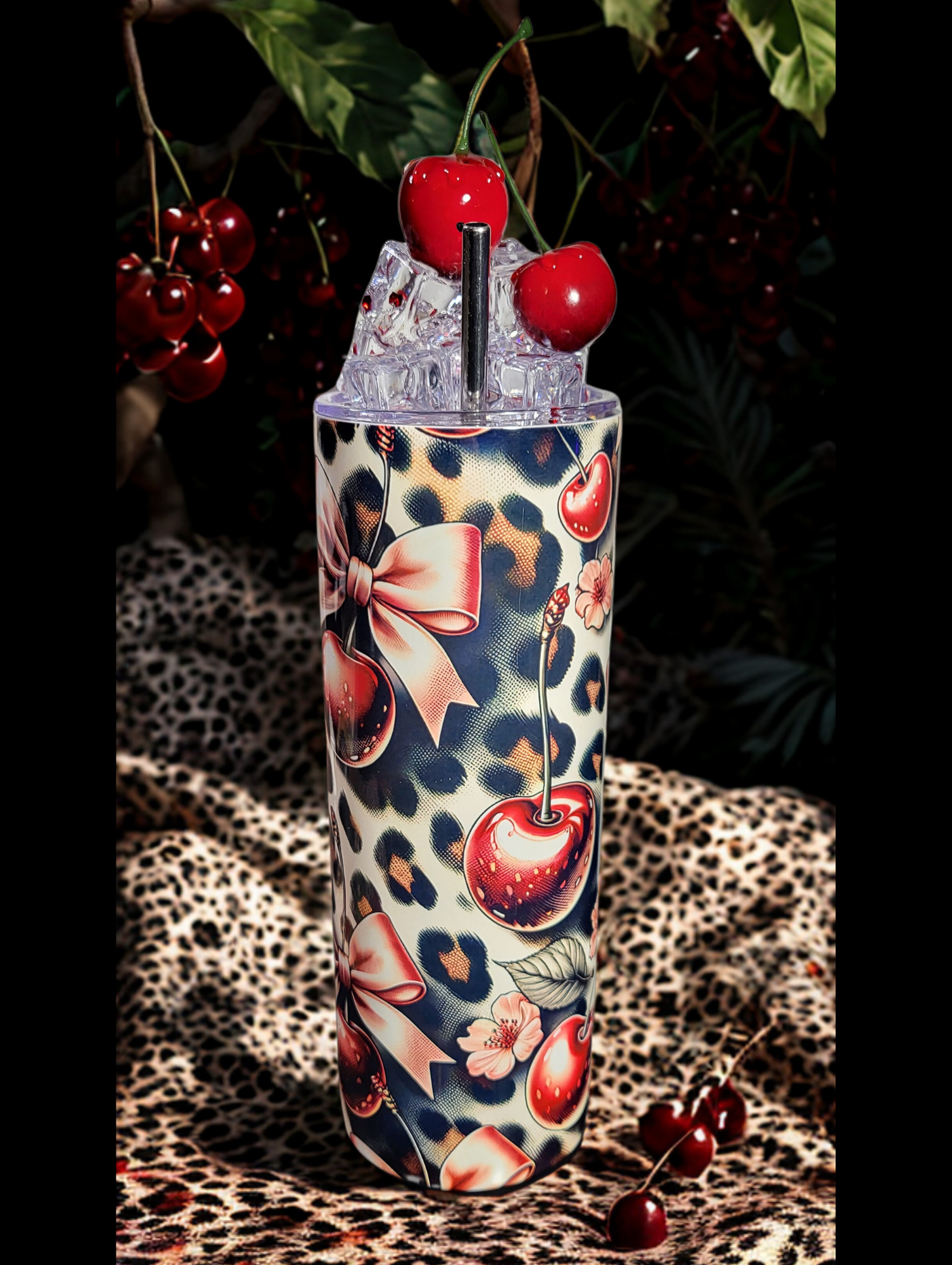 Wild, süß und absolut unwiderstehlich – dieser Tumbler ist ein echtes Statement-Piece für alle Rockabellas, Pin-up Queens und Cherry Bombs! Das verspielte Design kombiniert saftige Kirschen mit zartrosa Schleifen auf einem frechen Leopardenmuster – ein Mix aus Retro-Vibes und Wild-Cuteness. Gekrönt wird das Ganze von einem realistisch gestalteten Deko-Topping mit glitzernden Eiswürfeln und glänzenden Kirschen – zum Verlieben schön!