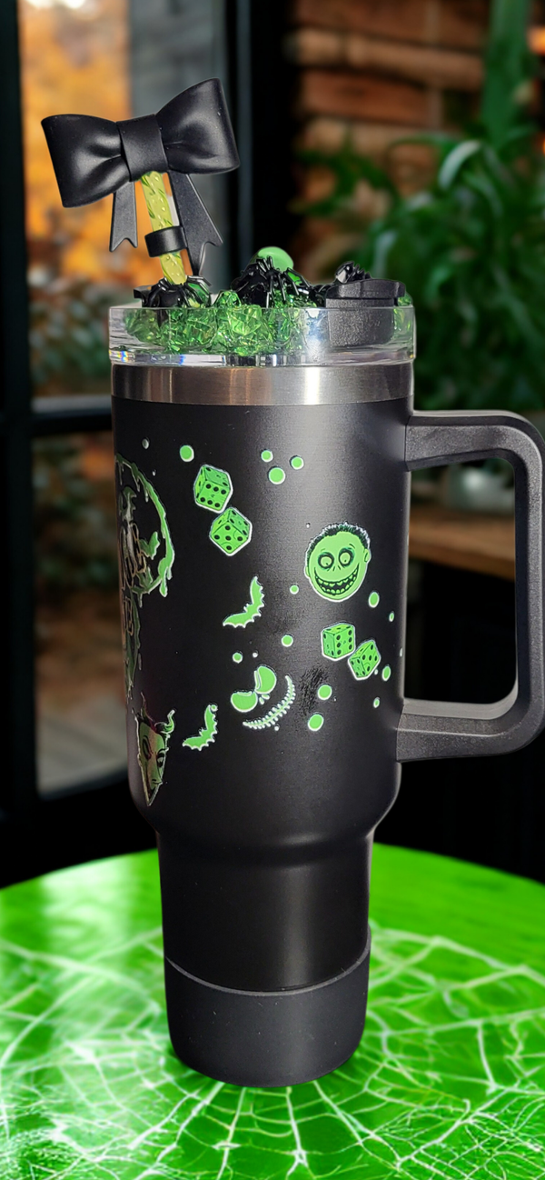 Mit grün-schwarzem Dekodeckel im Crystal-Look, Spinnen, Mini-Oogie und einem schwarzen Schleifen-Strohhalm wird jeder Schluck zum Halloween-Moment. Der Deckel ist steckbar, der Becher hat einen großen Henkel für festen Halt und ist ideal für unterwegs – ob Kürbisfeld oder Couchgrab.