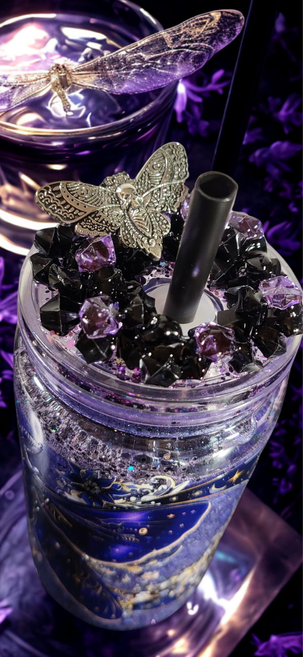 Ein Schluck Magie gefällig? Mein „Lunar Moth“ Tumbler bringt die Nacht zum Glitzern – mit einem intensiven Blauton, silbernen Details und einer majestätischen Nachtmotte als zentrales Motiv. Schwarze und violette Kristallsteine krönen den Deckel, verziert mit einer Gothic-Metal-Motte. Die Glitzerflüssigkeit im Inneren tanzt bei jeder Bewegung – wie ein dunkles Elixier unter dem Sternenhimmel.
