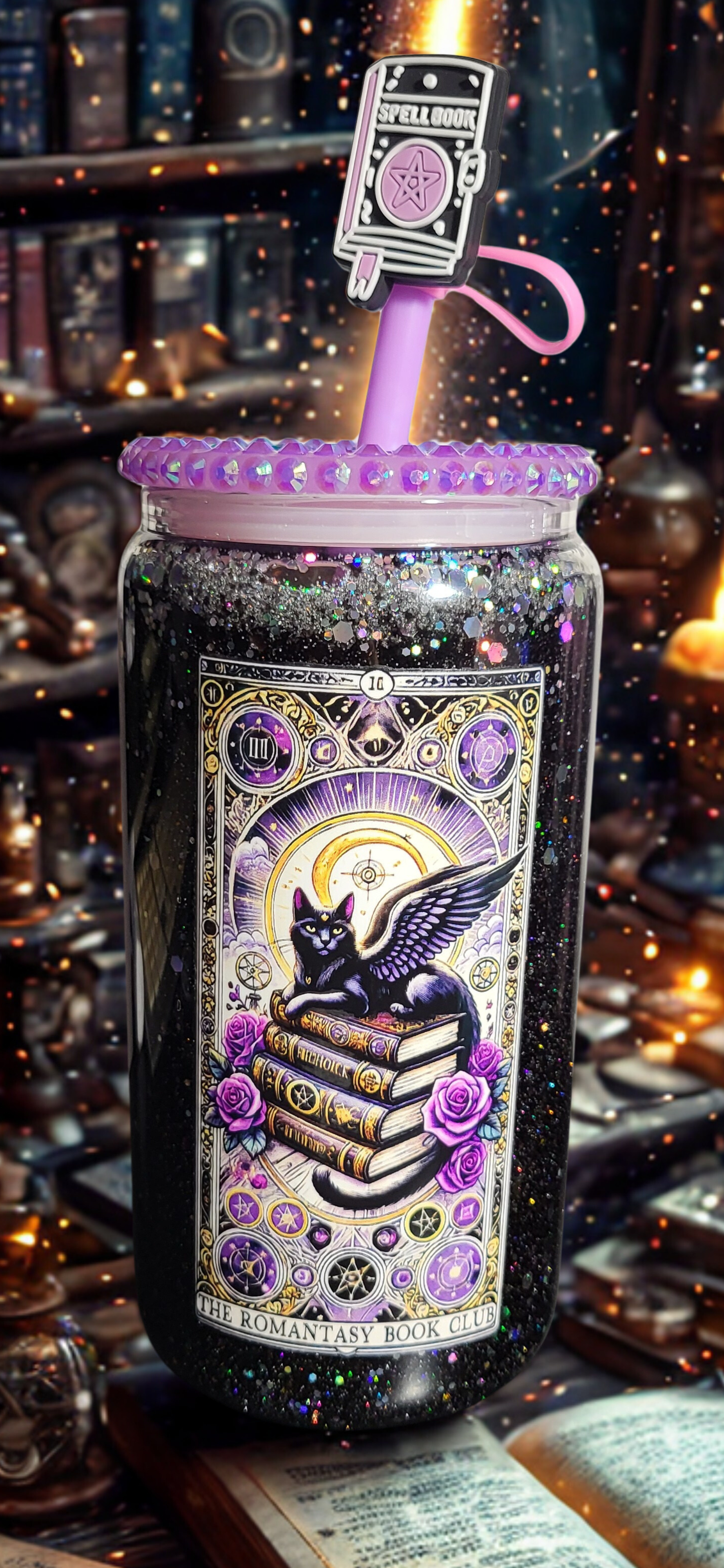 Der handverzierte Deckel funkelt wie ein Zauberkristall und wird durch den lilafarbenen Trinkhalm mit Spellbook-Anhänger perfekt abgerundet. Hydratisieren? Ja. Aber mit Stil, Magie und ordentlich Witch Vibes. 🌙✨