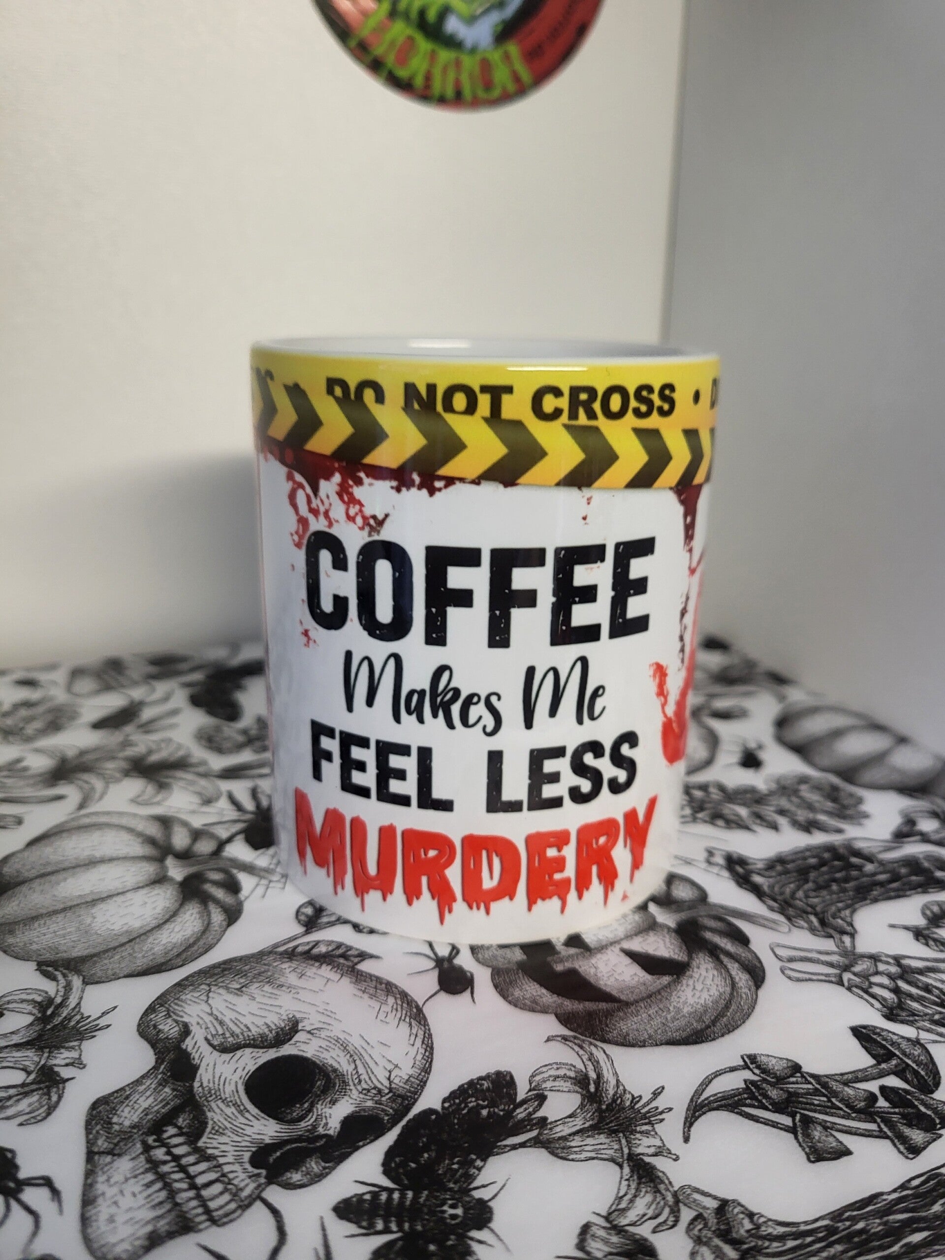 Für alle, die ihren Kaffee als wahren Lebensretter sehen: Diese Tasse mit dem humorvollen "Coffee Makes Me Feel Less Murdery"-Design ist der perfekte Begleiter für stressige Tage. Mit blutigen Akzenten und einer Do Not Cross Warnung bringt sie den nötigen Humor und die nötige Energie.