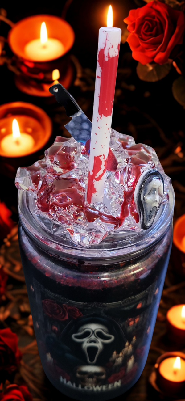 Schaurig-schön und absolut ikonisch: Dieser 16oz Acryl-Tumbler ist ein Muss für alle Scream-Fans und Horror-Liebhaber! Mit Ghostface im düsteren Rosen- und Kerzen-Design sorgt er schon beim ersten Anblick für Gänsehaut. On top: blutige Eiswürfel-Optik, ein gestreifter Strohhalm im Blutspritzer-Look und passender Ghostface- & Messer-Topper, das perfekte Accessoire für deine Halloween-Drinks.