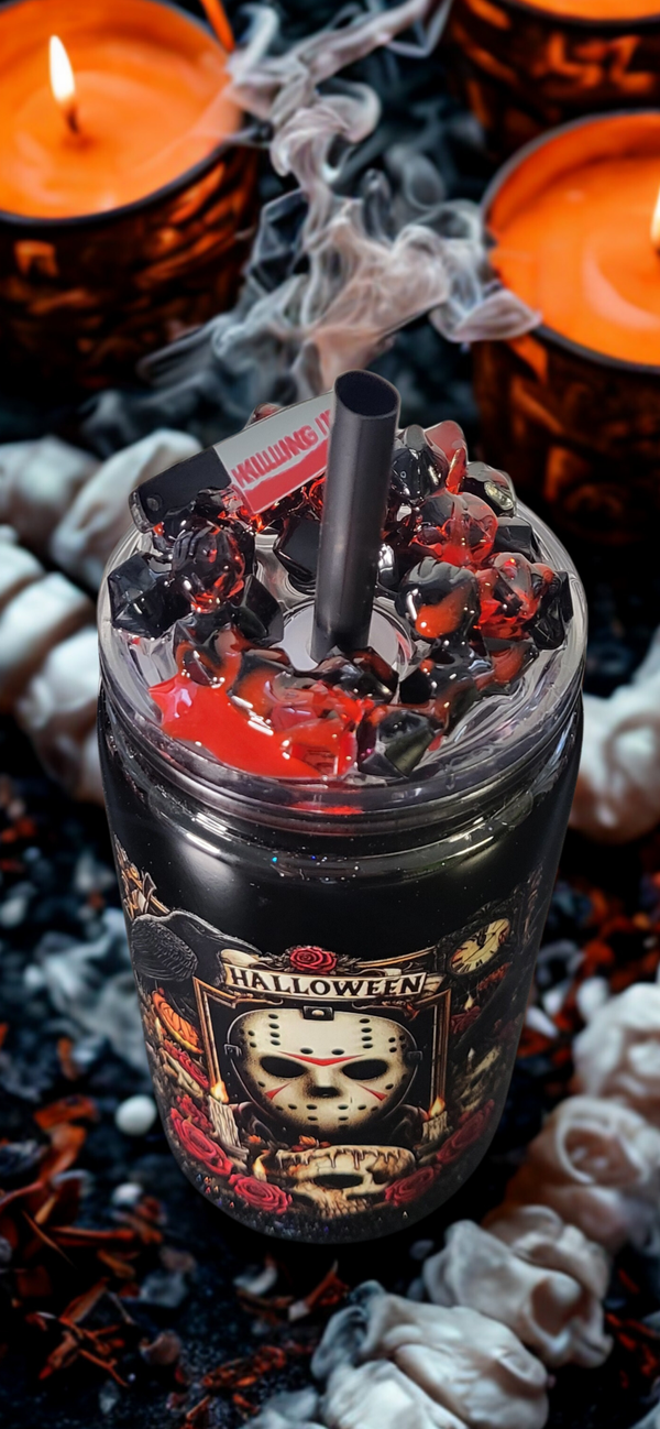 Ein düsteres Kunstwerk zum Mitnehmen: Schwarzer Glitterboden, ikonisches Masken-Design, Rosen, Schädel und Kerzen, dieser Tumbler ist pure Horror-Ästhetik. Der Deckel kommt mit blutrotem Ice-Look und schwarzem Strohhalm für den perfekten Dark Vibe.