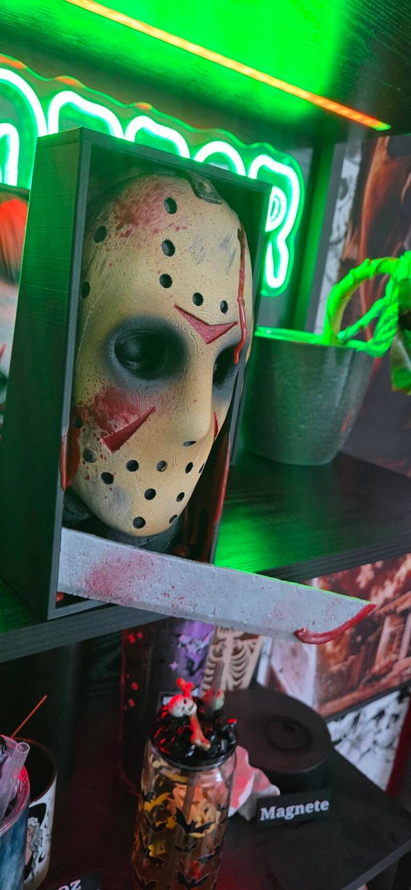 Diese ikonische Horror-Maske wirkt, als würde sie direkt aus der Dunkelheit hervortreten. Eingefasst in einem schlichten Rahmen und kombiniert mit einem blutverschmierten Messer entsteht ein intensiver 3D-Effekt, der sofort ins Auge fällt.
